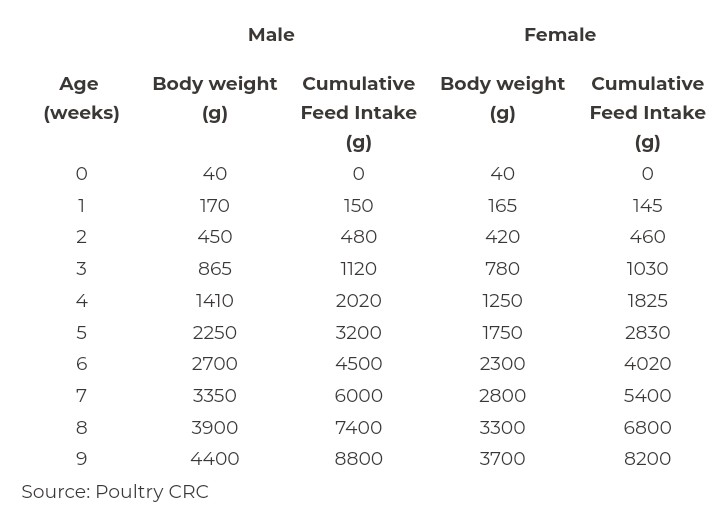 A female broiler chicken will consume about 6.8kg and weigh 3.3kg at 8 weeks